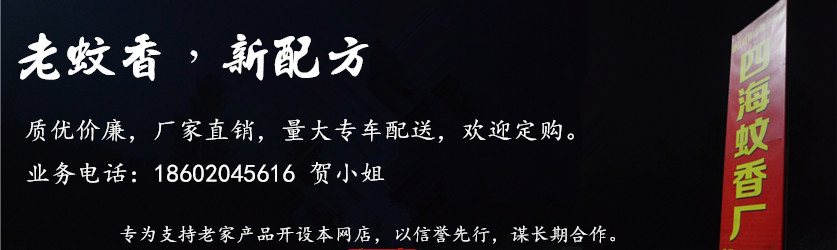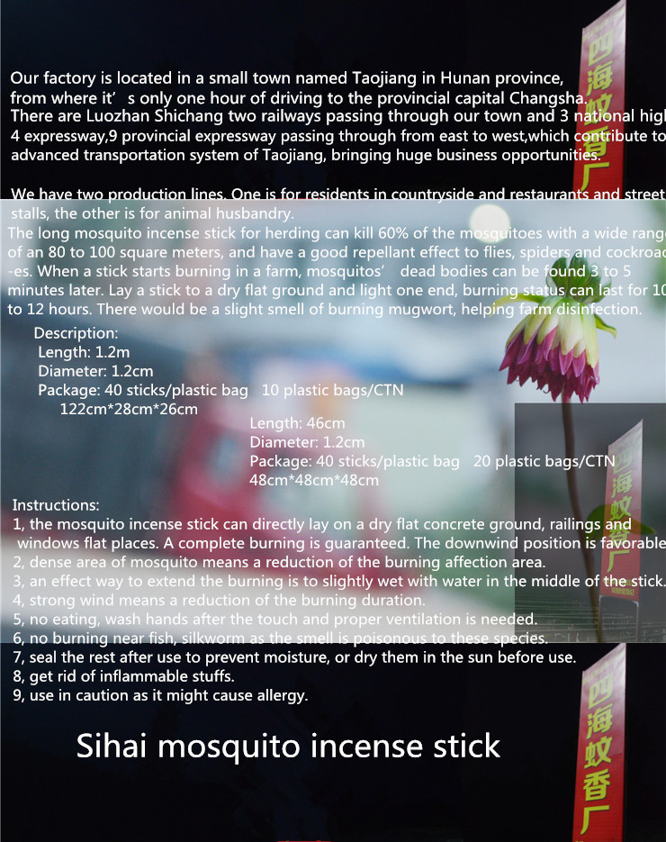 The long mosquito incense stick for herding can kill 60% of the mosquitoes with a wide range of an 80 to 100 square meters, and have a good repellant effect to flies, spiders and cockroaches. When a stick starts burning in a farm, mosquitos dead bodies can be found 3 to 5 minutes later. Lay a stick to a dry flat ground and light one end, burning status can last for 10 to 12 hours. There would be a slight smell of burning mugwort, helping farm disinfection.